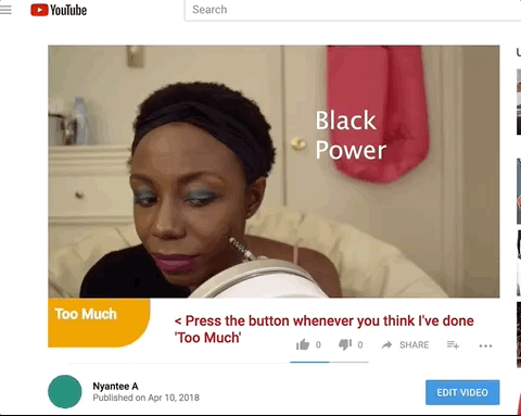 Throughout the video, participants can click on a button reading “too much” to indicate when they feel my makeup is excessive or inappropriate through a chrome extension I built. I chose the phrase “too much” because it is a popular phrase seen often in the comment boards under videos where women are doing their makeup or expressing themselves in ways that are seen as performative or attention-seeking. When the button “too much” is pressed, the current frame of the video is selected and stored below the video, hidden from the participant until the end of the viewing.
